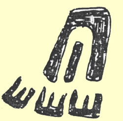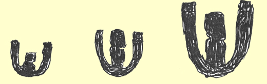 والذي يؤيد هذا هو وجود حرف الشين مكرراً أربع مرات علي يسار الناظر إلى النقش، فيكون مع الجزء الأول في الجهة اليمنى مشكِّلاً لأربع كلمات، وهي كلمة واحدة مكررة أربع مرات، وهي كلمة (tassis) أو (tassus) إذ يصلح الحرف ( معنى الكلمة: لا بد من أنَّ الناقش أراد أن يقول شيئاً من رسمه للشمعدان وكتابة هذه الكلمة العبرية عليه بهذه الصورة، وهو أمرٌ يحتاج إلى تدبُّرٍ وتأمُّل، فالكلمة يمكن قراءتها قراءة عادية كما ذكرنا، فتعطينا كلمة (tassis) معنى "سواء بالياء أو الواو" وهو: واهن أو ضعيف، أو ضئيل، أو عاجز أو مقعد بسبب الشيخوخة. كما يمكن أن نقرأها من الجهة المعاكسة، فنقرأها عند ذلك مع المكوِّنات الأخرى (حلقات الشمعدان وحروف الشين في الجهة المعاكسة) بصورة (>ss) أي أساسات أو قواعد. ومن هنا فإنَّنا نرى أنّ معنى هذا النقش، لا يمكن الكشف عنه بسهولة، إذ تبدو الكلمة غير ذات معنى إلا بعد ربطها بالنقش وتداخلها معه، ولعل المعنى الأولي الذي يمكن استخلاصه منه يتعلّق بضعف الشمعدان التدريجي، إذ يبدو الضعف قليلاً إذا ربطنا كلمة (tsy/w) مع الحلقة العليا من الشمعدان وهي أصغر الحلقات، مما يوحي بأن الضعف سيبدأ من المكانات العليا، وإن كان يبدو ضعيفاً، ثمَّ يتسع الضعف مع الحلقة الوسطى، وبعدها يأخذ أوضح صوره وأشدّها اتّساعاً في الحلقة الدنيا، كما في الشكل (2) دلالات الشمعدان الرمزية: يظهر الشكل التالي رمز الشمعدان في أقدم صوره: | ||